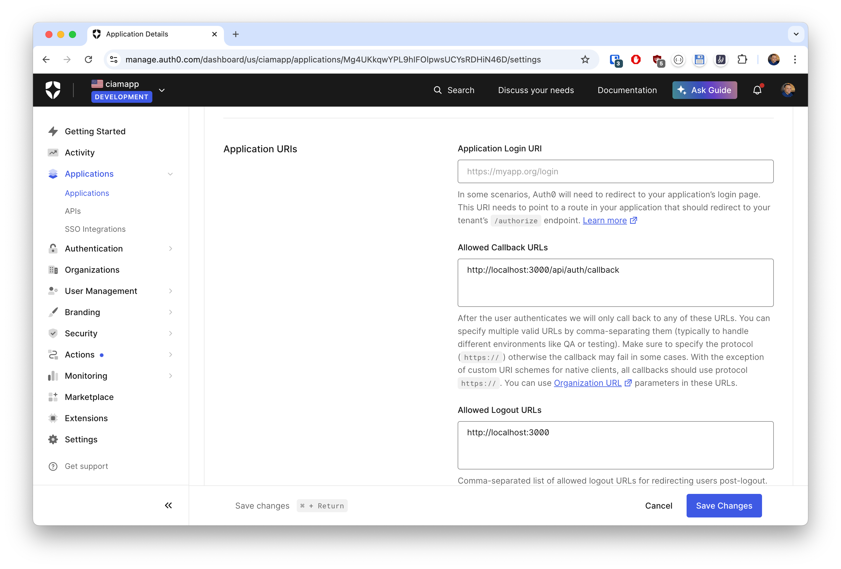 - Allowed Callback URLs: http://localhost:3000/api/auth/callback
